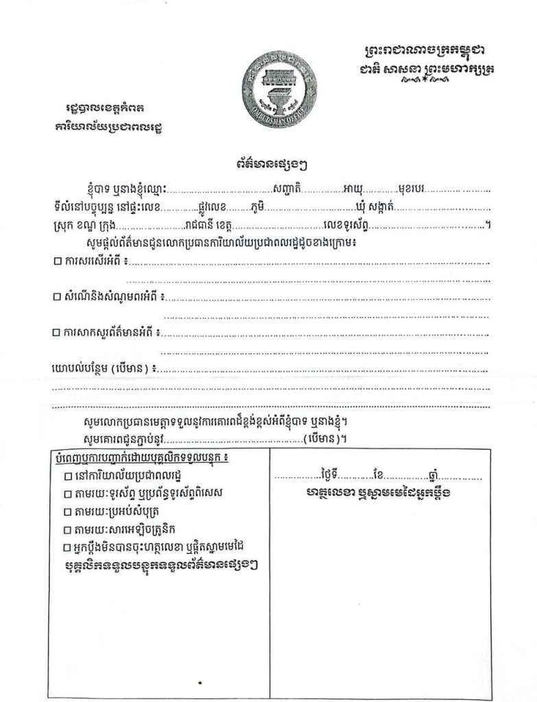 ព័ត៌មានថ្មីៗព្រឹត្តិការណ៍សេចក្តីជូនដំណឹង សំណើរ និងសំណូមពរ បងប្អូនប្រជាពលរដ្ឋនឹងទទួលបានតាមរយៈទម្រង់ផ្តល់ជូននេះបាន និងផ្ញើមកកាន់តេឡេក្រាម 012781587 41 នាទី មុន 3 ដោយ savuth អត្ថបទទាក់ទង ព័ត៌មានថ្នាក់ខេត្តព័ត៌មានថ្មីៗសេចក្តីជូនដំណឹង សេចក្តីជូនដំណឹងរបស់ការិយាល័យប្រជាពលរដ្ឋ 38 នាទី មុន 3 ដោយ savuth ព័ត៌មានថ្នាក់ខេត្តព័ត៌មានថ្មីៗព្រឹត្តិការណ៍ ឯកឧត្តម ម៉ៅ ធនិន អភិបាលនៃគណ:អភិបាលខេត្តកំពត បានអញ្ជេីញចូលរួមអមដំណេីរការអញ្ជេីញរបស់សម្តេចកិត្តិសង្គហបណ្ឌិត ម៉ែន សំអន ឧត្តមប្រឹក្សាផ្ទាល់ព្រះមហាក្សត្រ ជាអធិបតីក្នុងពិធីក្រុងពាលីបុណ្យបញ្ចុះខណ្ឌសីមាព្រះវិហារថ្មី ស្ថិតក្នុងវត្តពោធិ៍ព្រឹក្សាខារាម (ហៅវត្តតូប) ដែលមានទីតាំងនៅភូមិត្រពាំងព្រីងខាងជើង ឃុំត្រពាំងព្រីង ស្រុកទឹកឈូ ខេត្តកំពត នាព្រឹកថ្ងៃសុក្រ ៩កើត ខែអាសាឍ ឆ្នាំម្សាញ់ សប្តស័ក ព.ស. ២៥៦៩ ត្រូវនឹង ថ្ងៃទី៤ ខែកក្កដា ឆ្នាំ២០២៥។ 4 ខែ មុន 3 ដោយ savuth ព័ត៌មានថ្នាក់ខេត្តព័ត៌មានថ្មីៗព្រឹត្តិការណ៍ ឯកឧត្តម ម៉ៅ ធនិន អភិបាលនៃគណ:អភិបាលខេត្តកំពត បានអញ្ជេីញចូលរួម ចុះពិនិត្យផ្ទៀងផ្ទាត់និយាមកា និងបោះបង្គោលព្រំដីជានិមិត្តរូប សម្រាប់គម្រោងព្រែកជីកហ្វូណនតេជោ ដែលមានទីតាំងនៅតាមបណ្តោយផ្លូវជាតិលេខ៣៣ ក្នុងស្រុកកំពង់ត្រាច នៃខេត្តកំពត។ 4 ខែ មុន 3 ដោយ savuth ព័ត៌មានថ្នាក់ក្រុង-ស្រុកព័ត៌មានថ្នាក់ខេត្តព័ត៌មានថ្មីៗព្រឹត្តិការណ៍ ឯកឧត្តម ម៉ៅ ធនិន ចុះជួបសួរសុខទុក្ខ និងនាំយកអំណោយមនុស្សធម៌ផ្តល់ជូនគ្រួសារប្រជាពលរដ្ឋរងគ្រោះដោយខ្យល់កន្ត្រាក់ នៅស្រុកបន្ទាយមាស 4 ខែ មុន 3 ដោយ savuth ព័ត៌មានថ្នាក់ខេត្តព័ត៌មានថ្មីៗព្រឹត្តិការណ៍ ឯកឧត្តម ម៉ៅ ធនិន អភិបាលនៃគណៈអភិបាលខេត្តកំពតនិងលោកជំទាវ បានអញ្ជើញចូលរួមពិធីបុណ្យវិសាខបូជា និងរាប់បាត្រព្រះសង្ឃចំនួន ៥៦៩ អង្គ នៅប្រាសាទដើមពោធិ៍ 6 ខែ មុន 3 ដោយ savuth ព័ត៌មានថ្នាក់ខេត្តព័ត៌មានថ្មីៗព្រឹត្តិការណ៍ ឯកឧត្តម ម៉ៅ ធនិន អភិបាលខេត្តកំពត និងលោកជំទាវ បានអញ្ជើញអុជធូប ថ្វាយគ្រឿងសក្ការៈ និងផ្ញីផ្កា នៅកន្លែងរូបសំណាកលោកជំទាវម៉ៅ 6 ខែ មុន 3 ដោយ savuth ព័ត៌មានថ្នាក់ខេត្តព័ត៌មានថ្មីៗព្រឹត្តិការណ៍ សូមជ្រះថ្លាអនុមោទនា ពិធីបុណ្យវិសាខបូជា🙏 6 ខែ មុន 3 ដោយ savuth ព័ត៌មានថ្នាក់ខេត្តព័ត៌មានថ្មីៗព្រឹត្តិការណ៍ ឯកឧត្ដម ម៉ៅ ធនិន ដឹកនាំកិច្ចប្រជុំគណៈកម្មការខេត្ត ត្រួតពិនិត្យការអនុវត្តន៍គម្រោងអភិវឌ្ឍន៍ហេដ្ឋារចនាសម្ព័ន្ធក្នុងក្រុងកំពត និងស្រុកទឹកឈូ 6 ខែ មុន 3 ដោយ savuth ព័ត៌មានថ្នាក់ខេត្តព័ត៌មានថ្មីៗព្រឹត្តិការណ៍ ឯកឧត្តម ម៉ៅ ធនិន អភិបាលនៃគណៈ អភិបាលខេត្តកំពត បានអនុញ្ញាតឱ្យក្រុមហ៊ុន Unitsky String Technologies Inc. ដើម្បីបង្ហាញអំពីបច្ចេកទេសថ្មីនៃការដឹកជញ្ជ